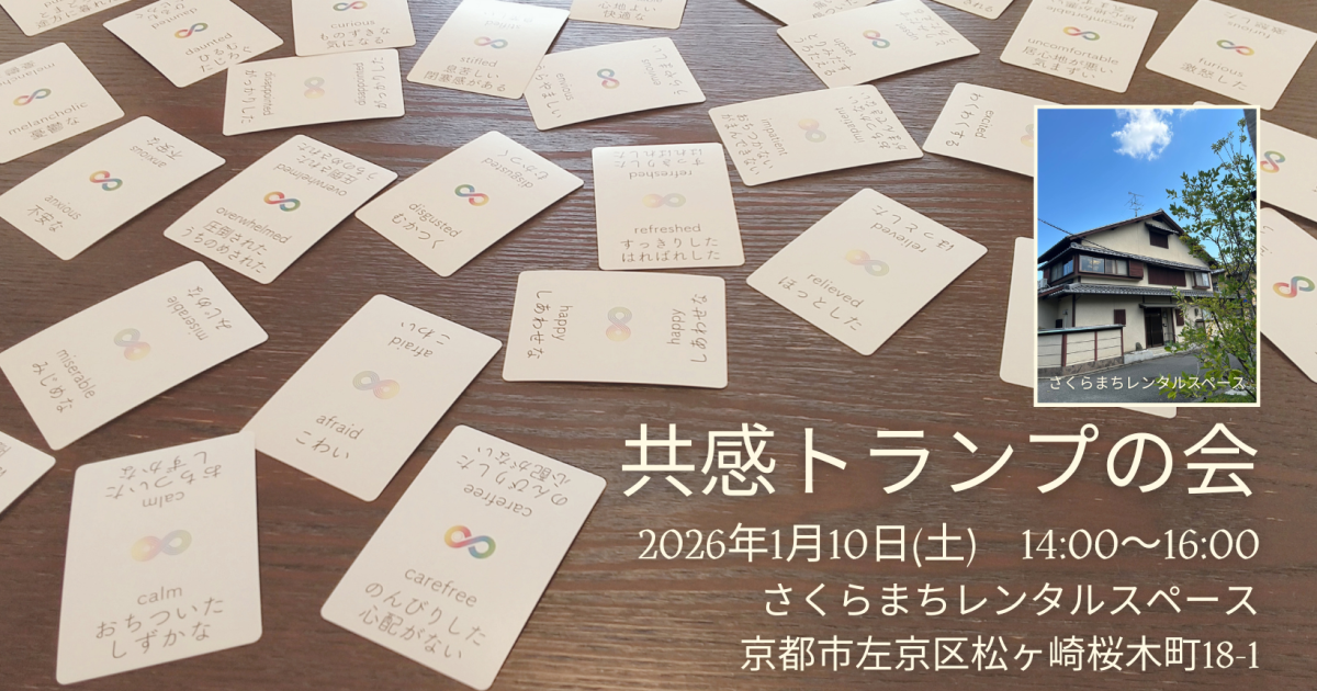 講師/ファシリテーター名:そら 主催者名:ものえじゅんこ 主催団体名:聴く話すラボ 日程:2026年/1月/10日 期間・回数: 開始時刻:14時 00分 終了時刻:16時 00分 開催方法:現地会場 開催場所:京都府 […]