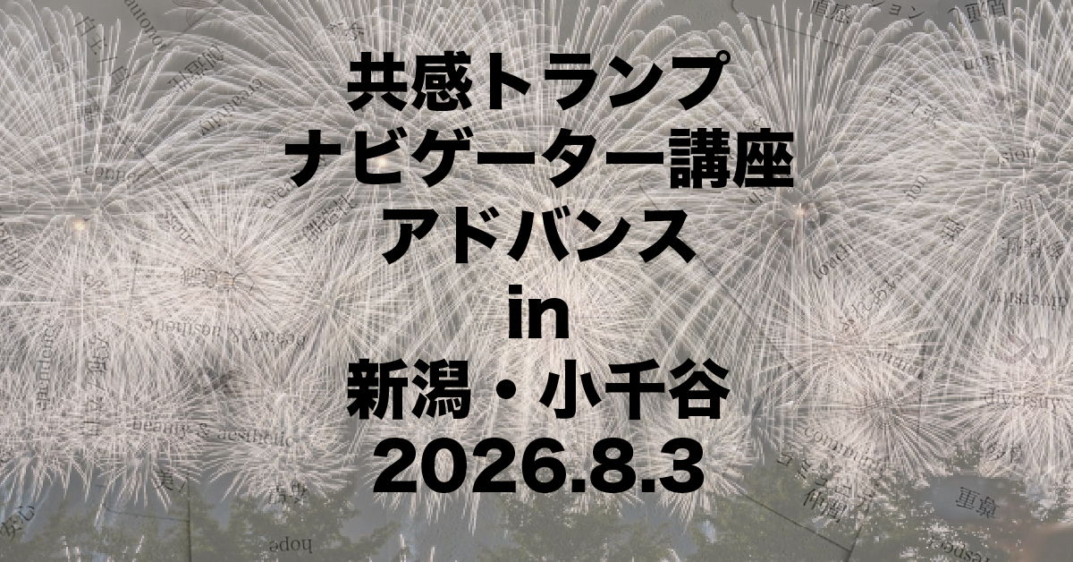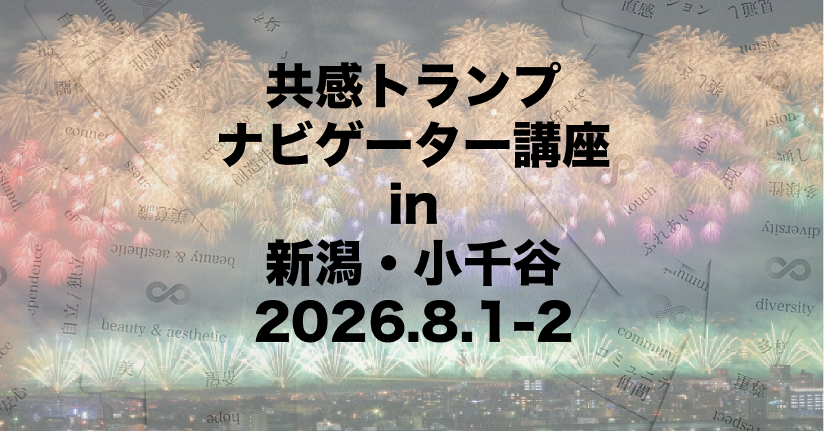 NVC基礎づくり修了生の熱い声に応え、 新潟県小千谷市で共感トランプナビゲーター講座開催決定‼️ 🧨毎年8月2・3日は長岡まつり大花火大会🎆 今回はまさにこの日に合わせたトラナビ講座です❣️ (アドバンス講座もあり!) […]