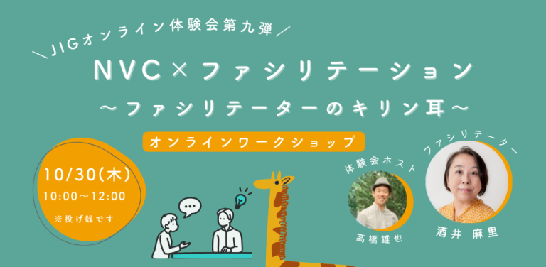 【online10/30】JIG 2025(NVC国内集中合宿)オンライン体験会第9弾!NVC×ファシリテーション 〜ファシリテーターのキリン耳〜〔酒井麻里 / 高橋雄也〕