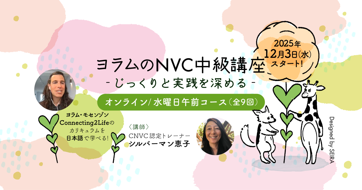 今までは『ヨラムのベーシック』コースを終えた方だけが参加可能な中級講座でした。今回からは、NVC講座を30時間受けた方ならヨラムのベーシックでなくてもご参加、可能です。